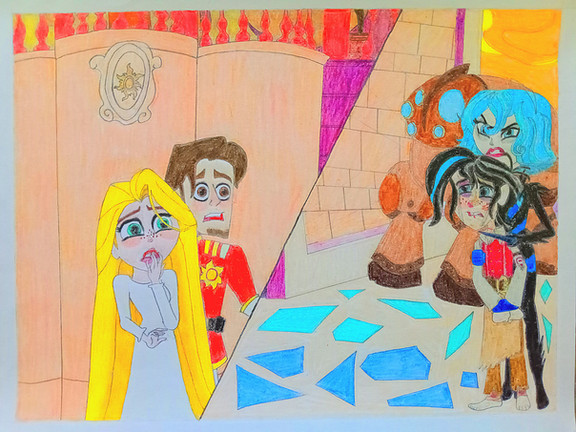 My third picture ever painted digitally on the computer. Man it was hard. I really need a drawing tablet.This picture is fan art for the series Keeper of the Lost Cities, Book 2 - Exile. I can't really explain it without giving away any spoilers, but I want to say at least this. It's basically Sophie, the main character, going inside Prentice's mind. Prentice has a shattered mind though, so his mind's pretty messed up. The girl to the left is Jolie, a memory form, and the dark figure to the right is Alden in memory form. This scene was one of the best in the whole series. It's awesome.
