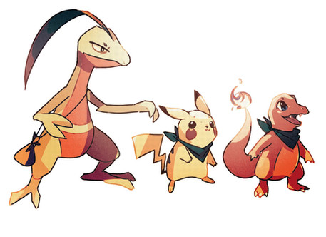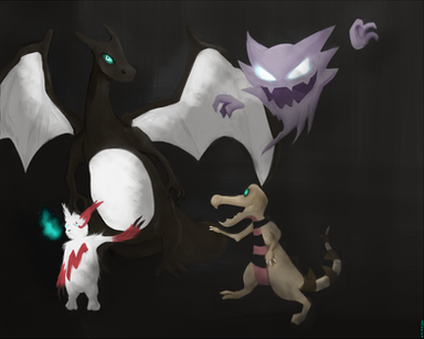 the ghosts of the nameless trainer's pokemon! (from pkmn-monochrome , which you should definitely read and send asks to)pikachu uses they/them, charizard uses she/her, blastoise uses he/him