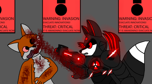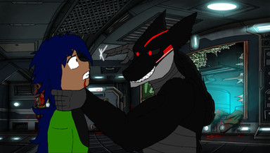 "No no no there must be a way out!" Fox kept running then saw a gap above him, roughly five feet high. Fox jumped up and began to climb in it. Suddenly the source of the noise was discovered metal panels were being ripped from the flooring and flying about. From the floorboards came tentacles with claws attached at the ends. "Ive got you filthy mammal...." A sinister voice called out. Fox gasped and ran through the new tunnel. The thing could be heard right behind him. "There is no escape from me! You will be consumed along with your HOME!" Fox saw an opening at the end on the floor. He ran as fast as he could and jumped to it, but something caught a hold of his neck. "GAH! NO!" It was some sort of wire that hanged from the celing. Fox struggled to free himself, breathing heavily in panic. "FRESH MEAT!" the voice behind him echoed. Fox pulled out a knife and sliced the wire from him, freeing him. He quickly leaped into the hole, a tentacle barely missing him. "This isnt the end mammal! I know this place better than you! I will find you!"