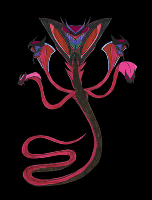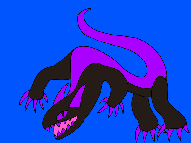 After a millennium of being physically weak, she grew enough power to recreate a new physical form. She now has the body of a massive serpent, her limbs were short stubby, yet made her very quick when climbing on surfaces. Her snout being useless was simply replaced of that of a serpents tongue to sense prey. And because her wings and horns were taken from her, she replaced them with a terrifying frill.