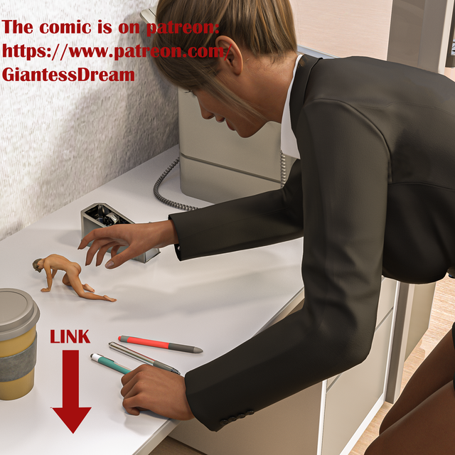I really love this picture, and the story is a big part of that--and not just because my name happens to be David too. Clearly, he is only her "superior" on paper. Rather than the typical image of an intern being bossed around and given menial tasks, she has flipped the script and is the one giving HIM an assignment. In this picture, it looks like she may already be back at her cubicle, since the computer is to her scale, and I don't see his desk anywhere. The way she's holding him projects a fascinating combination of daintiness and power, and I like her "imperfect" skin. Speaking of skin, she's probably showing a bit more of her chest than would typically fly in an office setting, so I have a feeling that she has just undone those buttons on her shirt. Might she be about to put him in there? If that's his "lesson," he may never do her assignments again.