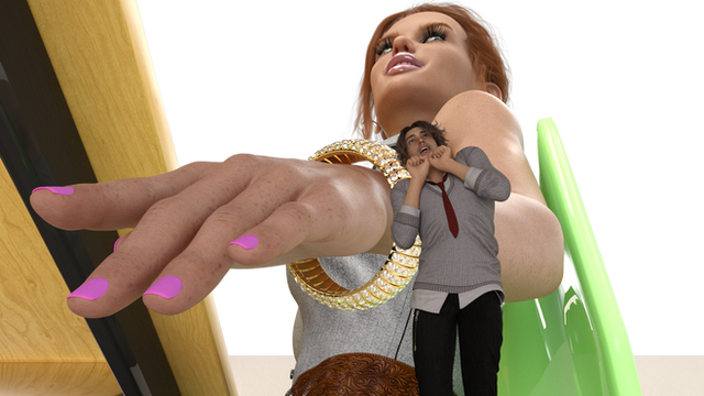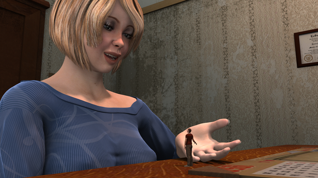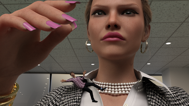 It's a truism in this world that the littlest people learn the biggest lessons. Susan was just a student intern from the local community college, while David had been working in the accounting department for six years now. But Susan was Big and David was Little. And when she instructed David to finish her assignment by today, she meant it. Leaning her bulking form over his desk, Susan unceremoniously plucked the little man's tie between her thumb and index finger. With a breathless sigh, she flatly told her trembling superior, "You'll have to learn to do what I tell you to do". Without pausing for a reply, Susan effortlessly lifted David's weightless body by the neck. "I will teach you," she mused as she walked back to her cubicle.Related content