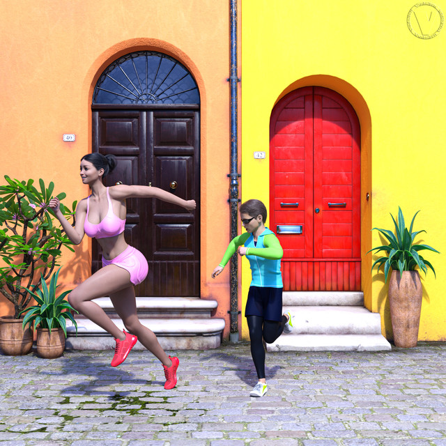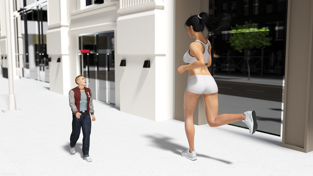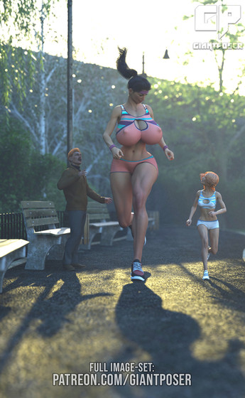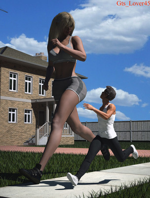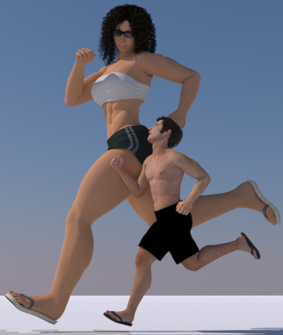 I like how she is jogging casually, and he is running for dear life, yet she will catch him easily. Talk about long strides