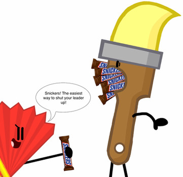 Paintbrush: SHUT UP!! *throws her high in the air, making her fall to death* As I was saying... *prepares to punch Fan*