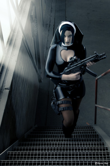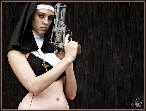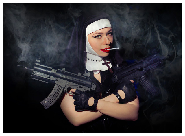 Ok, look I khnow what a nun is and does in real life. I am aware that they don't carry guns and take part in fire fights. But here is what you seem to miss: It's a model in a sexy nun costume, so the key word nun is appropriated. It's a piece of art it doesn't need to be realistic. Again what's the point you are trying to make with these links and please use your keybord to answer and not links.