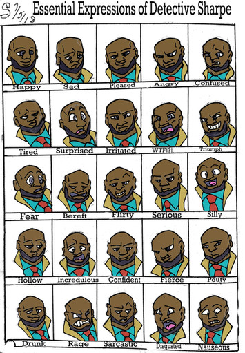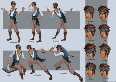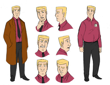 This is part of my production packet for the Prologue of Detective Ragger, the game I'm currently working on. So this consists of the in-game character portraits for Adrian, and a turnaround taken from his sprite's walking animation. I also included a frame from his idle animation and his investigation animation (which are still subject to change).--