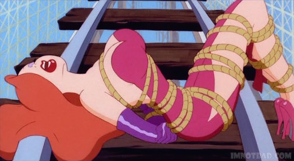 Today I gif you with Jessica Rabbit. Tied to the tracks in the Roger Rabbit short Roller Coster Rabbit. It's good but I wish those ropes around her chest wrapped around her arms as well.Related content