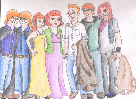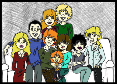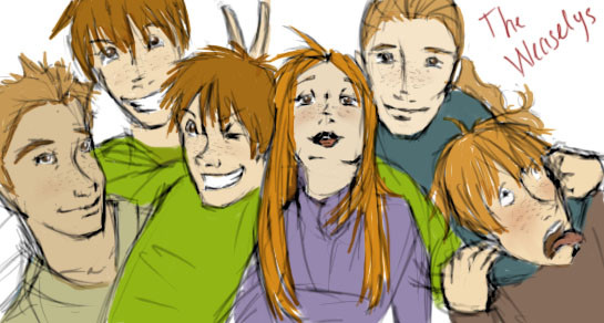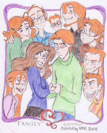 This was drawn by lberghol [link] it is the best Weasleys I ever seen. i added scars to bill and gave the twin I believe to be Fred wings and a halo and colored it. This way it's like Ronβs asking Hermione to marring him but then his family walks up and he gets embarrassed. Hope lberghol likes it and lets me keep it.Related content