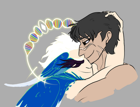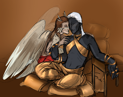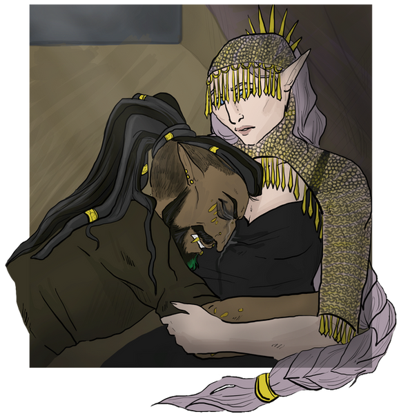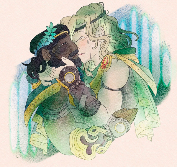 Haz, holding the man's warrior side and side at peace, embracing him whole.The Paladin, gently cradling Haz's damaged and blackened heart full of shards.