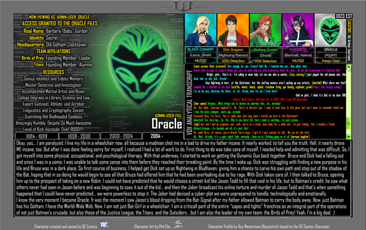 2-Continuing from that, I made Lee Tompkins her mother in reference to James Gordon and Lee Tompkin's love story in Gotham. Yes, yes, I know almost everyone hates Gotham, but I actually like some of the things in it, and Morena Baccarin's portrayal of Lee Tompkins is near the top of that list. And I did like Gordon and Lee's love story. So, in reference to all of that, Oracle here is the daughter of Gordon and Tompkins.