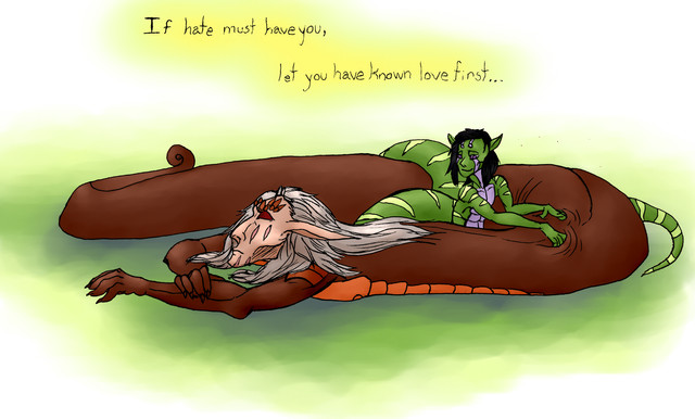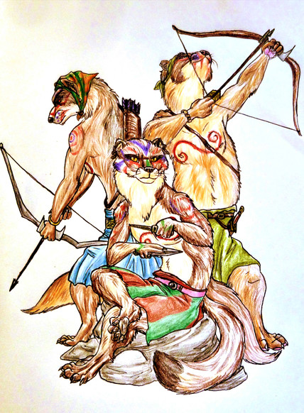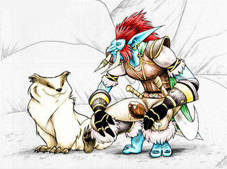 An Orcish Ranger--in the process of treating an infectious injury of an animal native to the Underground called a Deepmara... it's a sort of cow-sized rabbitoid critter, commonly kept for milking and for wool and occasionally to pull carts or haul boats upstream. Of course, in the expanses of the Underground there's a lot of wild ones too, and it's in a Ranger's interest to keep the herds happy and healthy. And to do the sniping of jerkwads who would go around injuring and harassing the deepmaras and other wildlife.