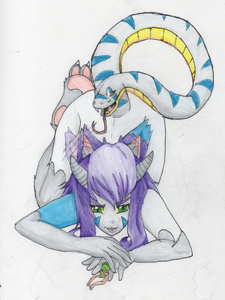 Begun coloring my ink drawings for the 30 Days of Vore Challenge leading up to Vore Day. :3 Well, sunlight in my studio area has been scarce, and with no scanner I must do something with my traditional art time. :\Drakness has gorgeous colors and such shiny coils. :3