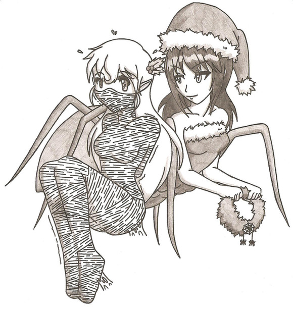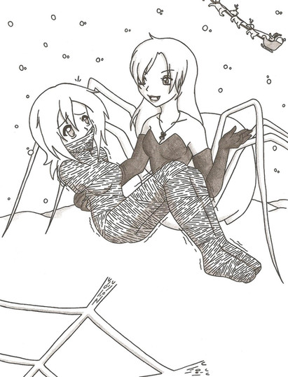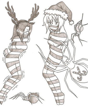 I wish I had a girlfriend like Sereph, a beautiful girl who would willingly let me kiss her lips, strip her down and mummify/cocoon her alive with duct tape, from her toes to a gagged mouth! Great little story and drawing! Also, I noticed the little spider toy under the tree. Merry X-MAS!