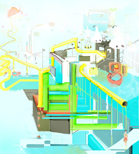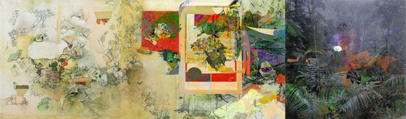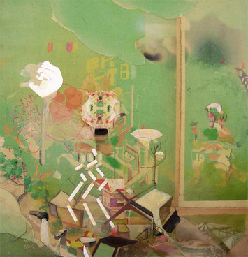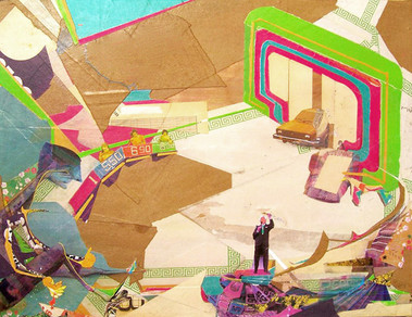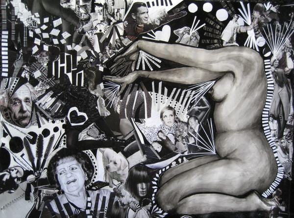 may gray skies rain bettering on you(collage, inkjet print of drawing, latex, pen, pencil on wood)