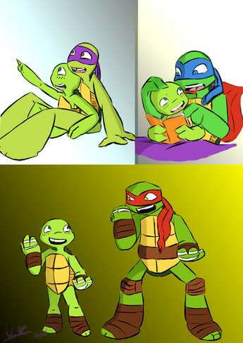 Raphael looks like he's up to his shell in kids! None of his children have his color, though. Gino must want to be a ninja like his dad. Looks like daddy needs a time out.