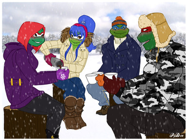 Sooo... A funny story.I've been enjoying the lovely pictures done by CelandineGranger and FlauxPG as part of the Secret Santa, depicting turtles in a snowy scene, complete with amazing backgrounds. See for yourself!