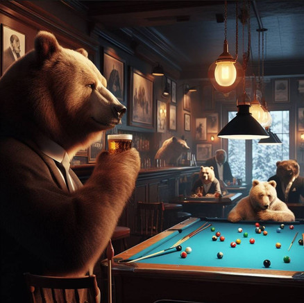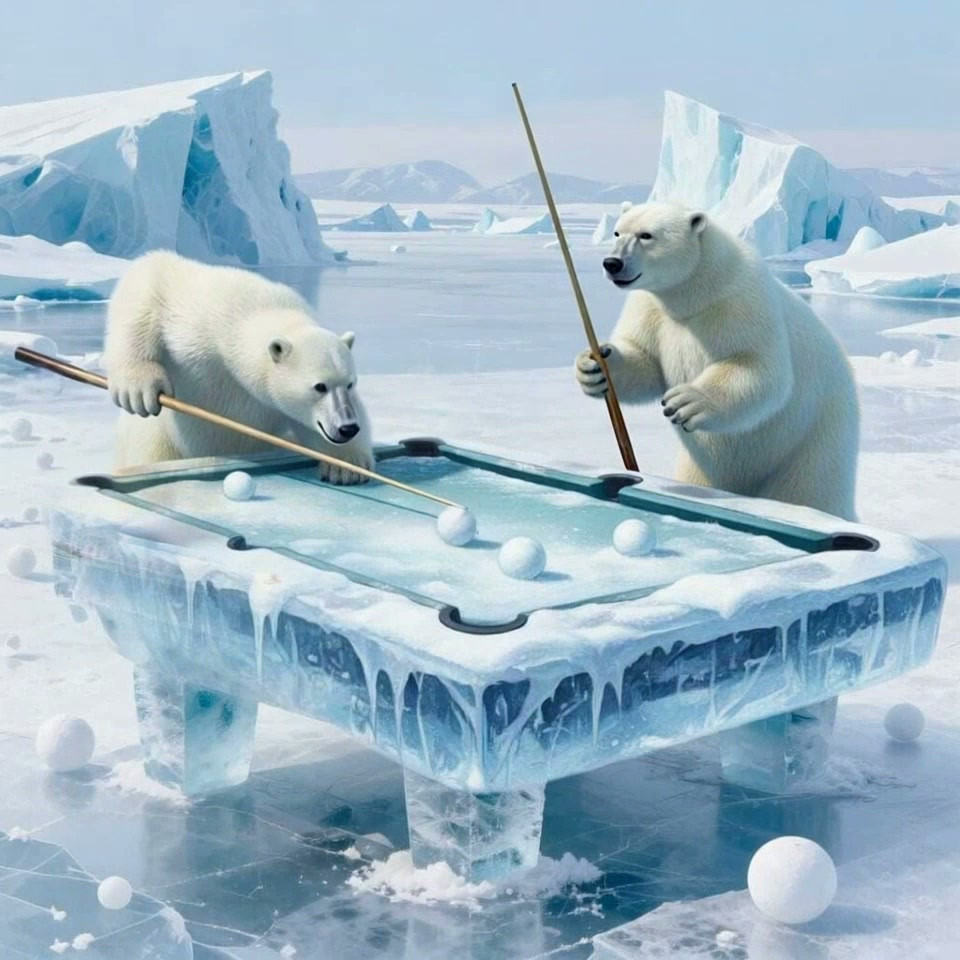 A Grizzly bear, a black bear, a polar bear, and a panda bear playing billiards...Reminds me of dogs playing cards.