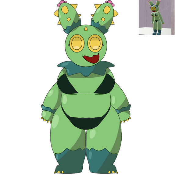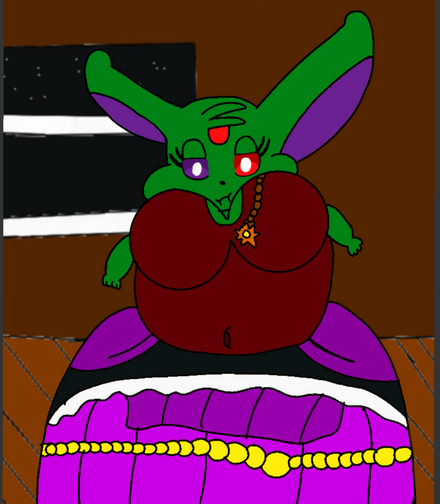 She's a fat egyptian belly dancer and she really loves doing it. She was wondering the desert until she met Rafael, after showing him what she can do he took her home and made a pyramid with a oasis where she is now. She can also inflate with water using some fat and never goes skinny.