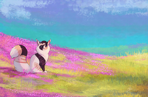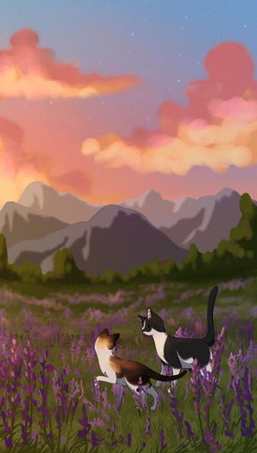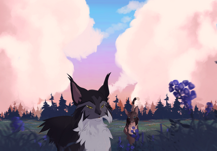 #bushes #cats #clouds #cute #fennecfox #flowers #fox #grass #hills #landscape #lighting #pinksky #plants #purpleflowers #scene #sphynx #sun #trees #warriorcats #warriorcatsoc #spookkit