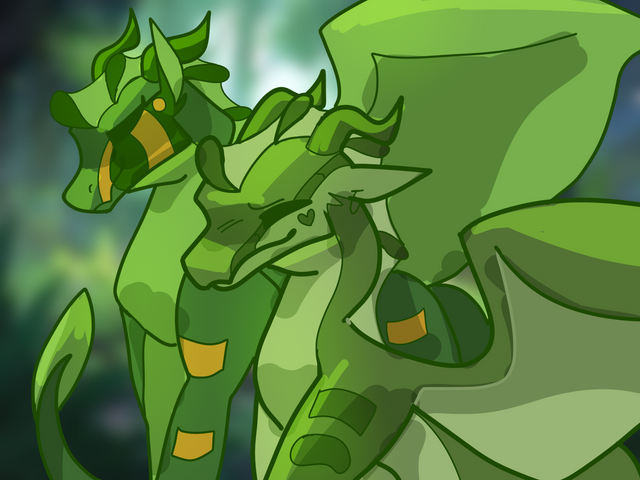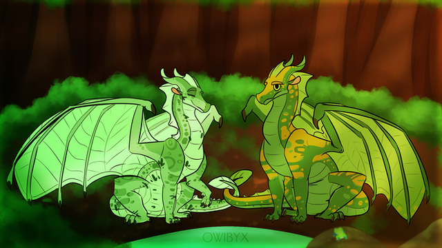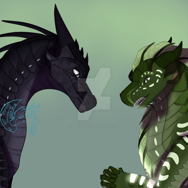 Pointy-face on the left is a Rain/Ice hybrid named Spearmint. His scales can only really change from greens to whites, he actually has some venom in his fangs that he can shoot out like a normal rainwing. It isn't quite acid though, or at least not very corrosive acid, it causes more of a cooling sensation more like an IceWing's breath. He's a bit of a rebel and can be intense or a jerk without really ever realizing it. Spearmint has a sort of nihilistic philosophy, and doesn't really care for others or even himself really. Sort of chaotic.