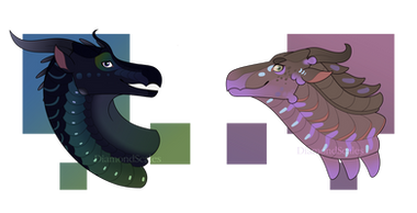 Fat-face on the right is a Sea/Night/Mud hybrid named Muck. (mom was a Sea, dad was Night/Mud) He has gills that work, though not as good as a full SeaWing, and he actually has both mindreading and prophetic abilities. Unfortunately, both powers are somewhat muddied most of the time and fade in and out. If he focusses really hard he might be able to read another dragon's mind more closely, but that's about it. Future seeing just comes and goes on it's own. Muck is often overbearing, nosy and has a facination with all hybrid dragon's. He even considers most hybrids better than full tribe dragons. He isn't very rude directly, but he often puts himself in other dragon's business and it isn't uncommon for him to push through personal space boundaries. It's out of his own curiousity for everything around him, but it often makes him look like a creep.