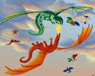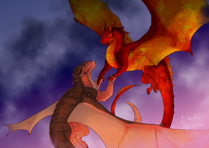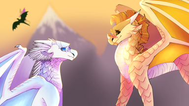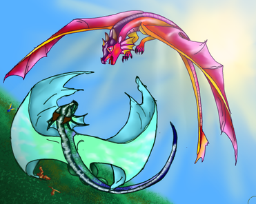 Once again I've been back into the Wings of Fire fandomI did this a while ago. It's an Ice-rainwing hybrid flying with her father and just in general having a nice time.
