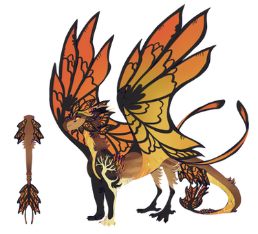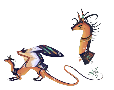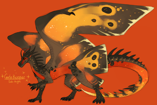 So here's the queen of the DayWings herself, Queen Daybreak. Plus some size comparison silhouettes to help show how big she is. The small yellow one is an average adult DayWing, the big dark one is meant to represent Darkstalker who was around 2000 years old Β if I'm not mistaken. Daybreak is around 5000 years old, she was alive even around the scorching and the end of it is when she officially took power.Daybreak is very smart, even when she was young - but she is also incredibly paranoid and cautious of everything. What she fears the most is death and she's done everything in her power to prevent it. dozens upon dozens of spells about the same kind of poison immunity, never dying of old age or impenatrable scales each worded differently just in case. On top of it all, her first line of defensive spells is a bunch just redirecting any kind of spell or animus enchantment put on her to another DayWing in the kingdom. She adds a new one to the list every time a DayWing is born, so say an animus manages to enchant something to make her explode - it will instead make a random other DayWing explode. So that's fun.