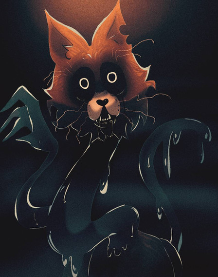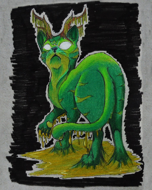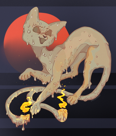 Seep is a mass of oily, black liquid who typically takes the form of an average-sized cat. The specific anatomy of which, Seep can change at will.Her form always appears slightly off to whatever it was previously, constantly shifting in self-conscious, subtle adjustments. Longer muzzle, bigger ears, smaller nose, shorter fur, thicker limbs… all shifted around and back again. What remains constant is a warped quality. There's an ever-present “off” feeling to her anatomy, how it bends and moves together… Uncanny valley might be the best term for it.
