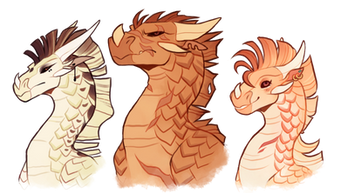 - Blaze is the odd one out, looking almost nothing like either of her parents. I feel like pink SandWings are quite rare, possibly a recessive trait, and Blaze being such a noticeable and vibrant pink made her eye-catching the moment she hatched. I have a small headcanon that Blaze got a bad scar on her neck from one of her sisters attempts to kill her, at first Blaze was mostly upset that the scar would hinder her beauty, but in the end Blaze found she can make anything look pretty. Also she's covered in glitter.