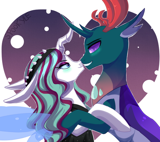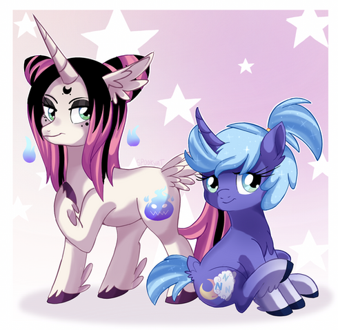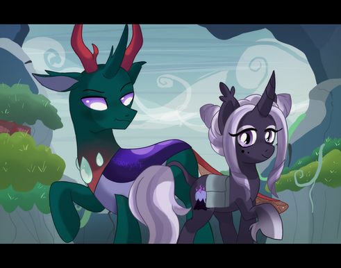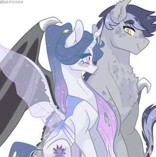 I drew Spectra with her special somepony, Midnight Shield. He is a lunar guard.