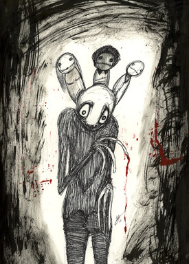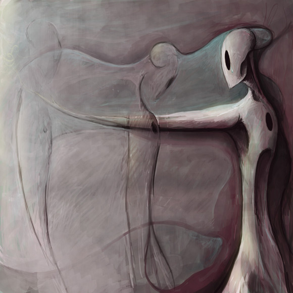 I have alot f pieces to comment on older thn this oe of yours but something about this piece drew me in and i decided to take a closer look. at first the black seemed like it ws it's own figure in the thumbnail with another figure holding it up and my brain didn't even read the title but i felt a strange death about it. And it still keeps changing. as I looked before the black area beaeath the figure looked as if it was an uncomfortable resting place for this lost soul that had given up i search of something but then as I typed and looked again it felt as if it was still living and the darkness was its spirit being drained away and pulled from it's weary body. BUt it all feels as if it's grusome if you peal away the corners. THe bodyseems broken, beaten fro perhaps one action or a life time of struggle while the mouth covered over as if it's been graffitied on. So harsh and quick as if the creatre had lost it's voice almost instanly and maybe that's what it is, we have so many freedms but often we don't have the things we want and no mater how much we cry out no one will listen.