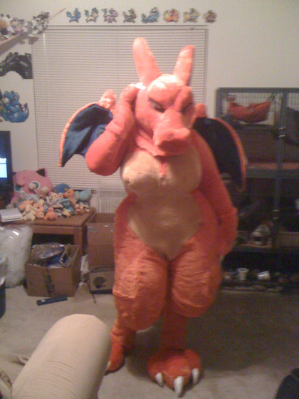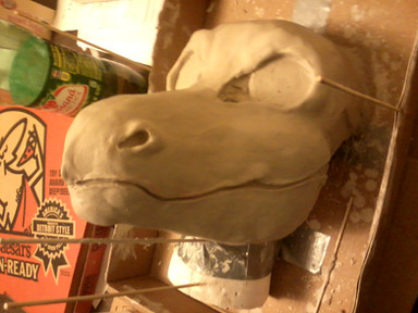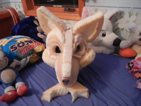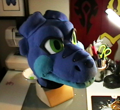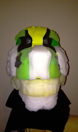 This is the first progress pic of the chrizard costume I made. This is the foam head base. I started with a balaclava over an accurately sized mannequin head. Then I added foam and cut it to the shape we wanted.The eye was just a paper stand in.