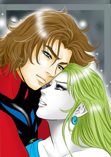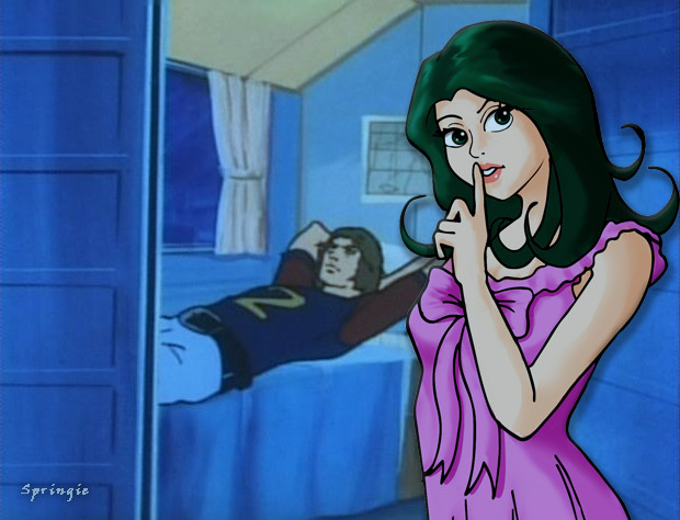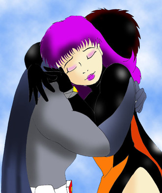 After a mission, perhaps? Jun looks distraught...either way, Ken and Jun are both exhausted...Background is a Gatchaman screenshot...