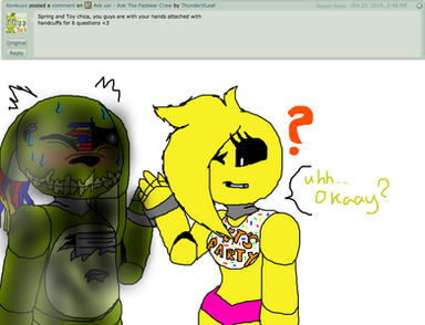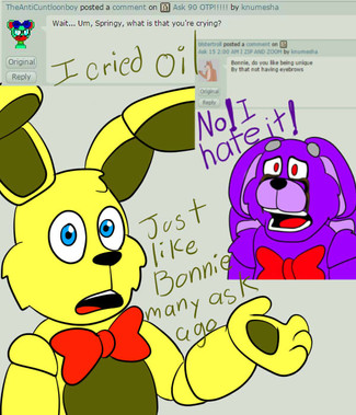 Springeh, why do you seem so depressed? Do you need a hug? ;-;(If you say no I swear to Zalgo, Slenderman, Mike Schmidt, the owner of Freddy Fazbears, and my mothah that...Well just check under your bed before you sleep, check the corners, shadows, and cams, I will be there. Β°_Β°) But still you seem like you need a hug.<3 SENPIA WILL NOTICE YOU.