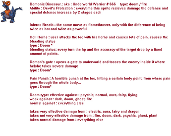 Signature move : Skull Bomber ( DoomCrawl flies high in the air, then dives down , causing his skull to explode on impact with the target. Afterwards his skull rearranges around his head ), is hit with 1/3 of the damage dealt as recoil Type : dark , PP:5 Power : 140 , Acc:90