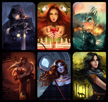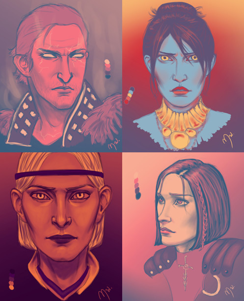 All portraits are rather into realistic style (with bit cartoonish) and has very different feels and attitudes. My favorite one is blue haired girl and black haired one.