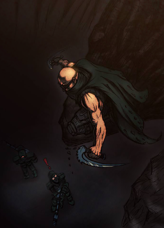 I like the lighting and the coloration. It's kinda surreal looking. The proportions are good, although he looks huge in size. Either way. I really like this style. Free flowing, but with constraints on realistic perspectives.
