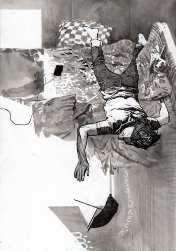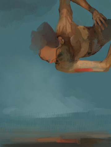 the only thing I'd like to see is a vertical layout instead of the horizontal, with the figure either in the middle or near the upper third. as is it's too static. the middle alignment would still be static but with more of an up-or-down feeling, as if he were floating in space. moving the figure up would give the fig a sense of rising. either would be more effective in conveying the feeling I'm picking up on it.