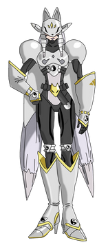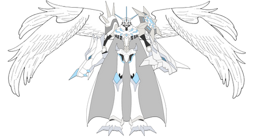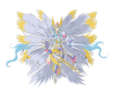 "Official Profile":ArchAngemon is an archangel digimon that belongs to the army of God, he fulfills the role of protector, while MagnaAngemon fights head-on with his sword, Angewomon with his bow protects from a distance, ArkaiAngemon fights with his fire spells, ArchAngemon has the mission to protect these three with his shields. His blue shield on his right arm protects against physical attacks, while his energy shield on his left arm protects against energy attacks.