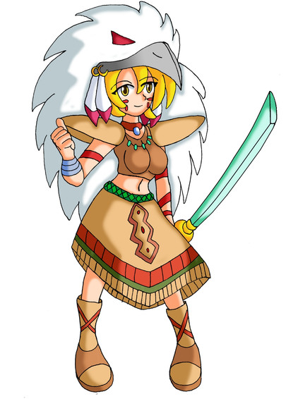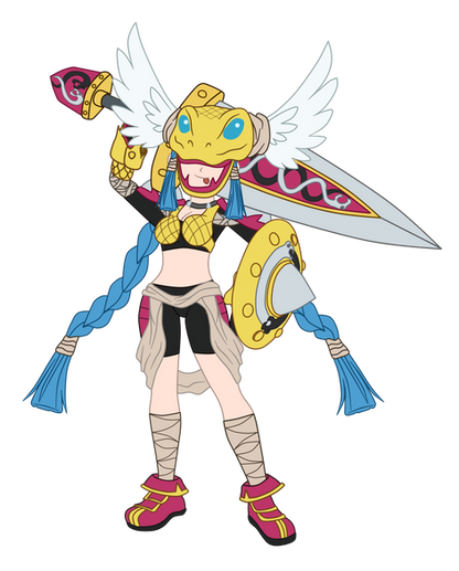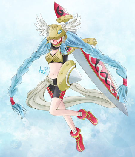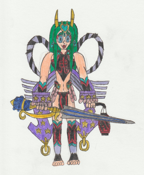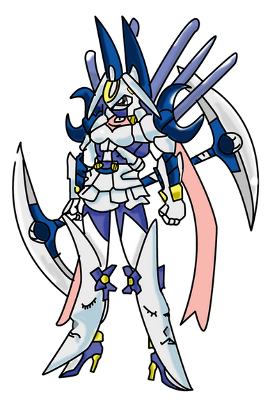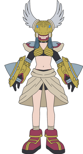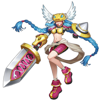 Reference Book: A God Man Digimon which belongs to the Olympos XII and has the appearance of a maiden. Though it has an extremely short physique, it possesses superhuman strength it uses to freely wield a greatsword as large as its own body. It possesses a cheerful personality due to its childlike innocence, but when its emotions become violently unstable, it gets into a bad mood which causes selfish and willful (problematic) behavior that no one can help it cope with. Its Special Moves are a forward rolling slash unleashed from its greatsword "Olympia" (Strike Roll) and a horizontal spinning slash too quick to catch with the eyes (Madness Merry-go-round). "Strike Roll" splits the ground, and "Madness Merry-go-round" creates a large tornado.