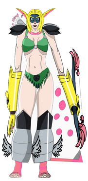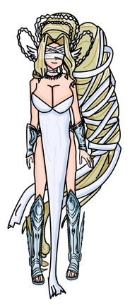 Perfil Oficial: Un Digimon del tipo Dios que pertenece a los Olimpos XII y tiene la apariencia de una doncella. Aunque tiene un físico extremadamente bajo, posee una fuerza sobrehumana que utiliza para blandir libremente una gran espada tan grande como su propio cuerpo. Posee una personalidad alegre debido a su inocencia infantil, pero cuando sus emociones se vuelven violentamente inestables, se pone de mal humor, lo que provoca un comportamiento egoísta y voluntarioso (problemático) que nadie puede ayudarle a sobrellevar. Sus movimientos especiales son un tajo rodante hacia delante que lanza con su gran espada "Olympia" (Strike Roll) y un tajo horizontal giratorio demasiado rápido para atraparlo con la vista (Madness Merry-go-round). "Strike Roll" parte el suelo y "Madness Merry-go-round" crea un gran tornado.