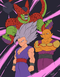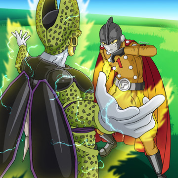 Drawing I've made for @VoReWiN of their OC with perfect cell and jaco from Dragonball. Ty again!