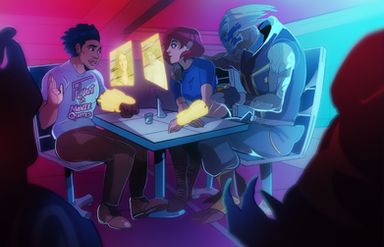Drawing I've made for ThatOneTurian, KirionRayen, N7JaneShepard, and AsariVanguard of their turian/shepard/asari OCs.