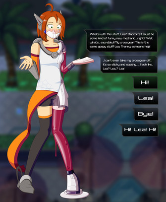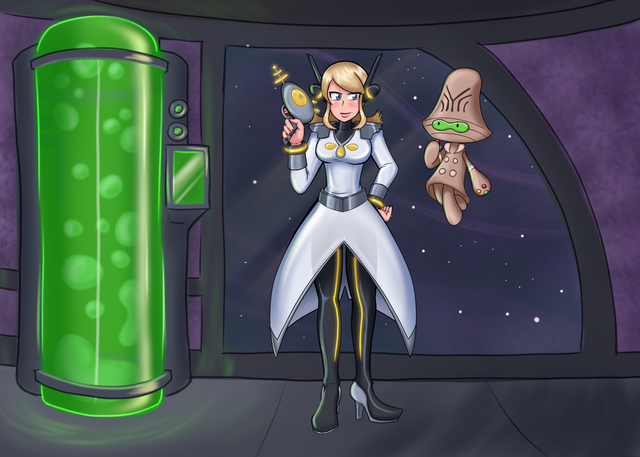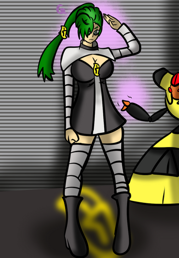 Athena gets all gooped up by some robot malfunction or another and gets to looking and acting a lot like Aura Blackquill. She probably won't be doing any defense attorney work anymore, but she'll probably attract a lot more people to the space station, so that's a plus. Not entirely sure how well she'll be able to work with a such a form fitting, squeaky outfit, but Aura seems to be able to do it.Be aware that I did not draw the background, it is ripped from the game. I'm too lazy to draw a background, I'm sorry.