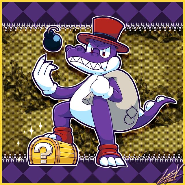 Very nice take on Croco. I really like the coloring, and palm trees. Nice touch having him holding the frog coin he stole from Mallow.