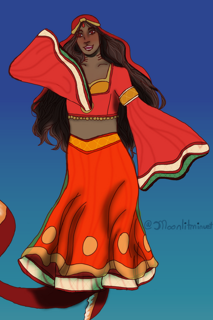 I love her colourful and thematic attire - especially the veil, cascading down her back.