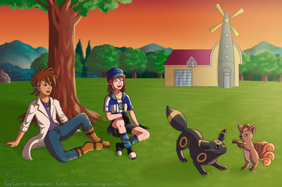 a painting of the moments after leaf receives eevee from that rooftop building in celadon city, releasing it from its pokeball for the first time