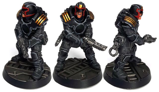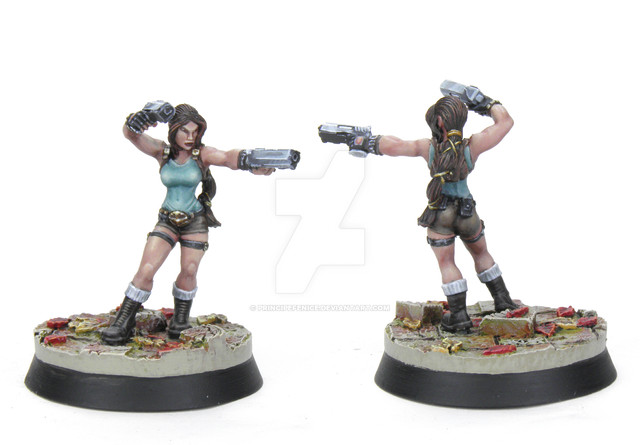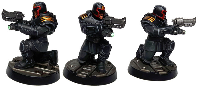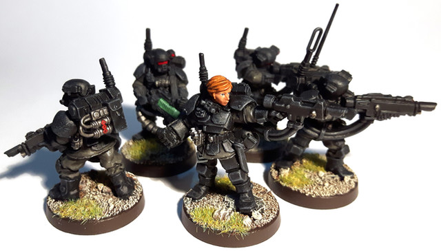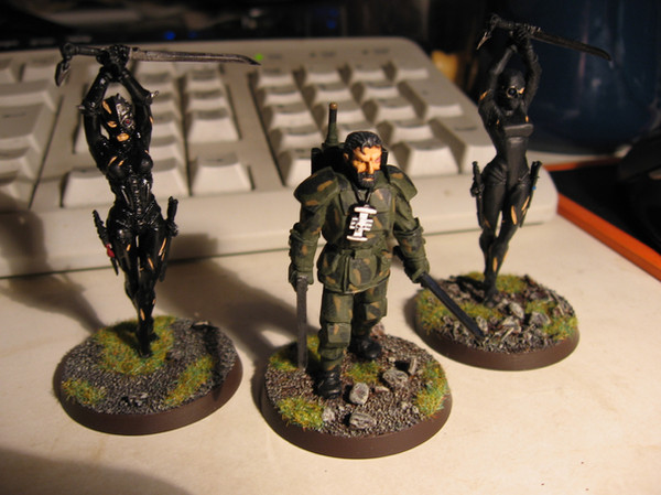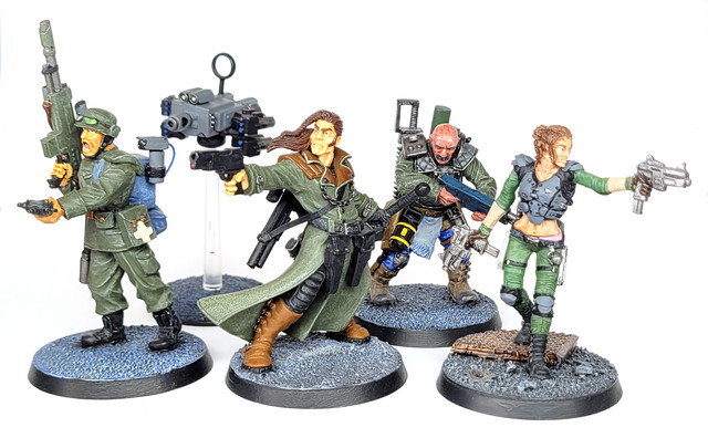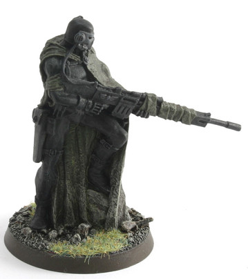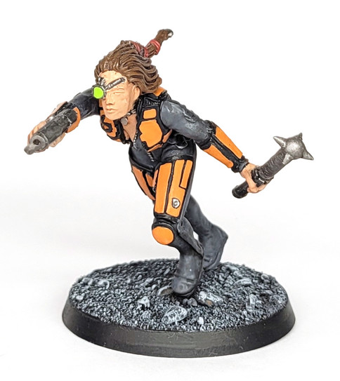 Kimo Fei, mercenary bounty hunter.A member of the warband led by Yoshi, pictured elsewhere in my gallery. They ply their trade generally with legal bounty hunting and other small mercenary jobs, but will turn their hand to other less legitimate trade if they need to and it's withing the bounds of their moral code. When Kimo first joined Yoshi, she was younger, having spent her youth in a pretty nasty underhive, so her fighting skills were quite good, but it was fairly non-specific, fighting to survive. She was a mild spook addict and a bit skittish. Also the model I made was pretty rubbish, the best I could do at the time. Now, 4 years later, I saw this model and realized that it's exactly right for Kimo once she's grown up a bit, become a competent mercenary, rather than just a fighter, given up spook, an acquired some more professional equipment.