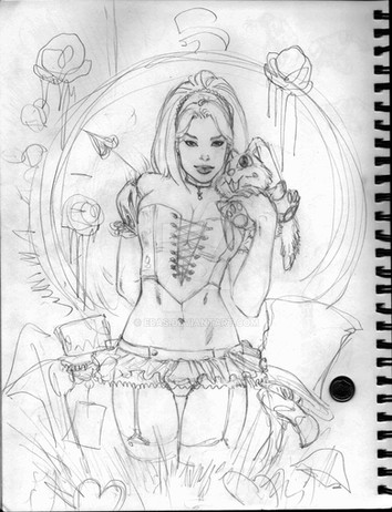 Finally, the second print I will be releasing at Phoenix Comic Con this year is this! Inspired by a costume my wife wore at the Amazing Arizona Comic Con 2011 this was another no-brainer when I first saw it. It had to be drawn and made into something more.This one proved to be a real challenge because I wanted it to resemble my wife as much as possible, and since so many of my girls’ faces already look like her I thought it would be relatively easy. But it’s Murphy’s Law that is something can go wrong it will, so I must have psyched myself out and redrew this face about dozen times before time became pressing and I just had to say, “f- it, I’m just going to put down what ever comes out”. I like the face as is but it looks nothing like my wife at all so this character may come up again sometime if to, if nothing else, settle my nerves.