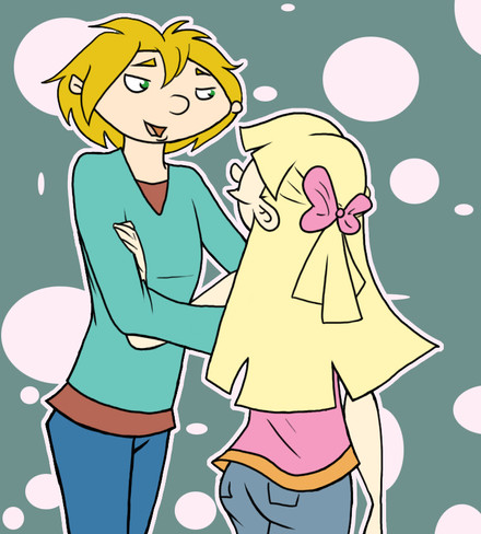 Im laughing on the inside cause he is still shorter than Helga and at the bottom he drawn kissing her on the cheek! He technacly have hold on to her shoulders or something!